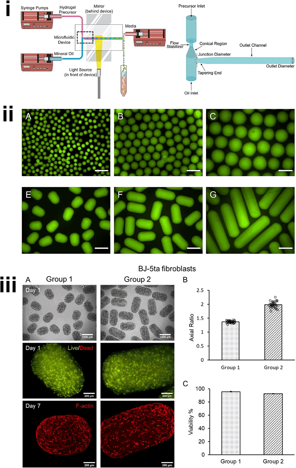 图5.(i)具有改进T型接头设计的微流控平台可对大型水凝胶微球(HMs)进行几何控制。(ii)不同几何形状的水凝胶微球。A-C)荧光显微镜图像显示,水凝胶微球具有高均一性、高圆度及较广的直径范围(水凝胶光交联所用光引发剂曙红Y的绿色自发荧光)。E-G)水凝胶微球具有高均一性及较广的纵横比(ARs)范围。比例尺=1000μm。(iii)不同纵横比的细胞负载水凝胶微球支持包封后细胞的正常活动。A)成纤维细胞负载水凝胶微球具有均一的几何形状和均匀的细胞分布(相差显微镜图像);包封的细胞在包封后保持高活性,并形成肌动蛋白丝网络(荧光图像)。B)成纤维细胞负载水凝胶微球在包封后1天,两组的纵横比分别为1.37±0.04(变异系数=0.03)和1.98±0.10(变异系数=0.05)(每组n>37个微球)。C)包封的成纤维细胞在包封后1天的存活率分别为96±1%和93±1%(每组n=3个微球)