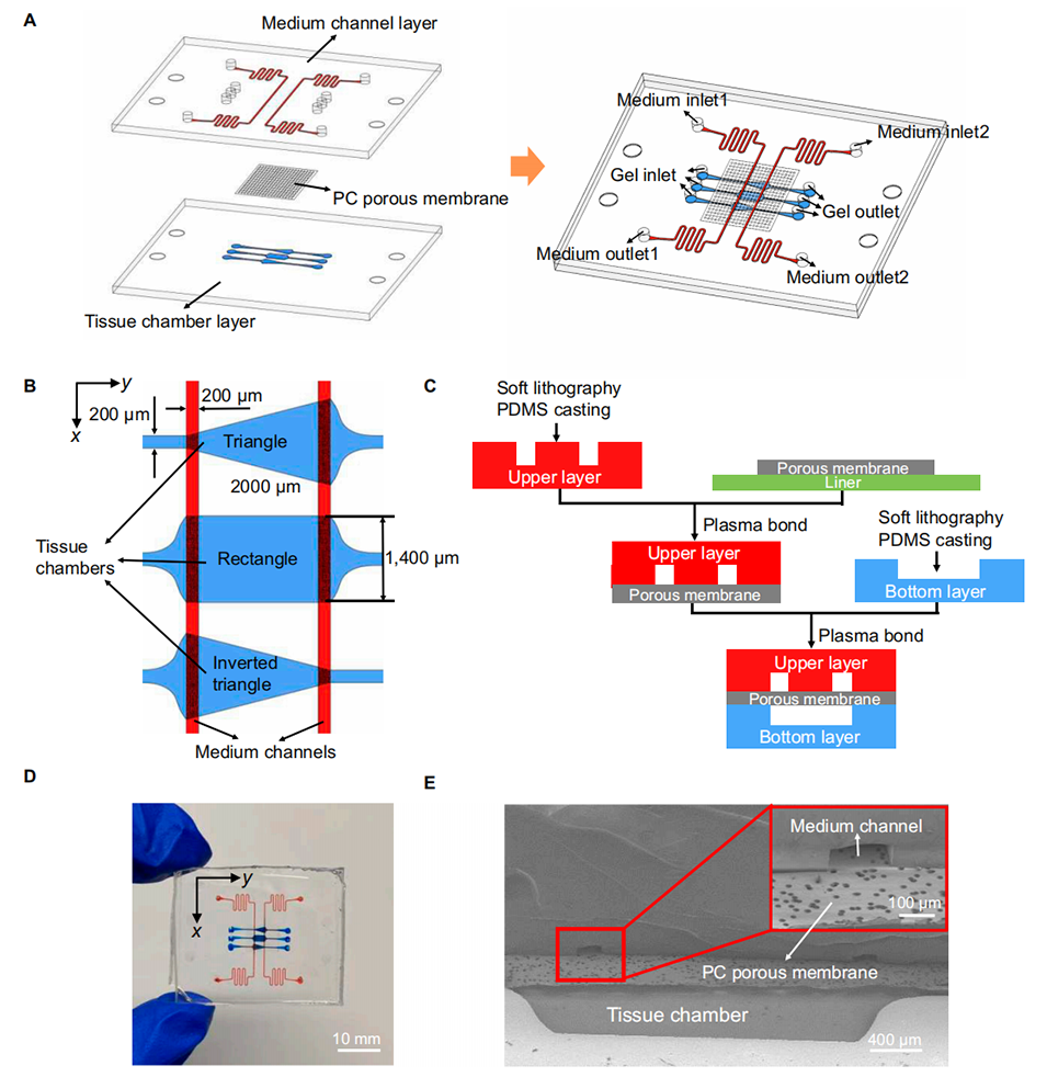 图 1. 多层微流控芯片的设计与制作。(A)多层微流控芯片的分解图与组合图。(B)培养液通道和组织腔的详细尺寸图。(C)通过多次键合制作的多层微流控芯片。(D)多层微流控芯片的实物图,其中红色表示培养液通道,蓝色表示组织腔。(E)培养液通道-多孔膜-组织腔的扫描电子显微镜(SEM)图像。