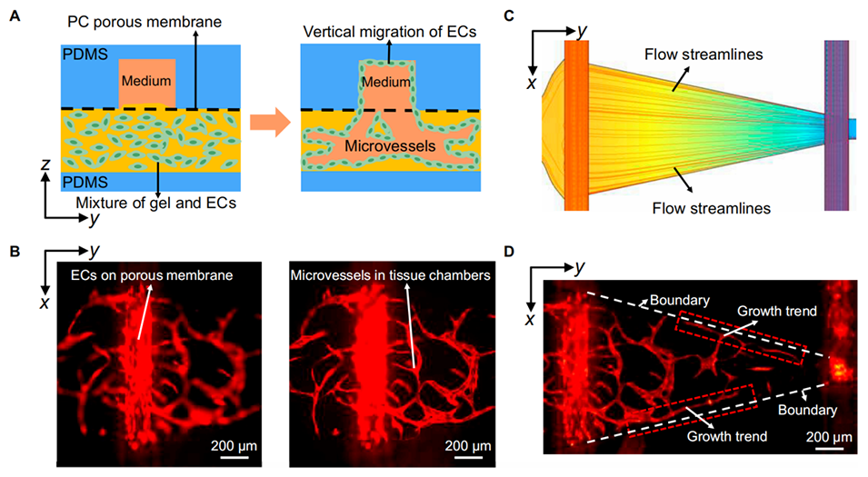 图 4. 流体刺激导致内皮细胞垂直迁移并影响微血管生长方向。(A)内皮细胞垂直迁移的示意图。(B)在培养液生长因子梯度刺激下,内皮细胞垂直迁移并生长到培养通道中。(C)倒三角形组织腔的模拟流线图。(D)微血管网络在流线影响下沿组织腔边界生长。