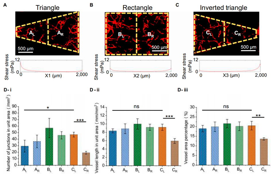图 5. 三种形状腔室左右半区微血管参数的定量分析。(A)三角形组织腔左半区(AL)和右半区(AR)的示意图。(B)矩形腔室左半区(BL)和右半区(BR)的示意图。(C)倒三角形腔室左半区(CL)和右半区(CR)的示意图。(D)各区域的(i)单位面积连接点数、(ii)单位面积血管长度和(iii)血管面积百分比的定量分析(平均值±标准差,n=4)。