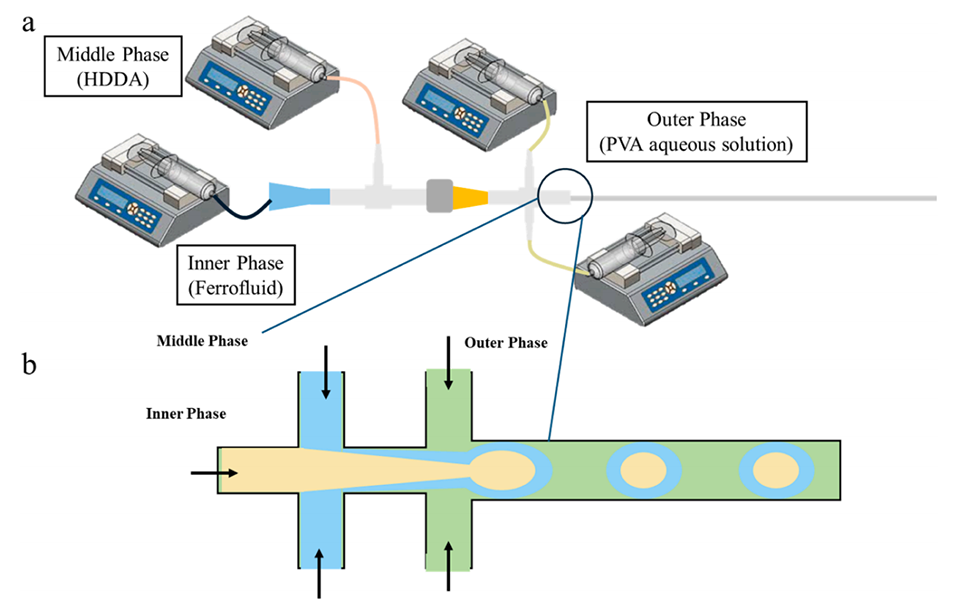 图1.(a)针式微流控装置。(b)用于形成双乳液的微通道结构。