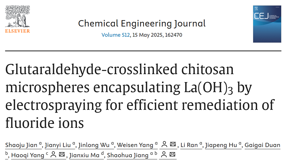 氟化物水污染严重威胁人类健康与生态环境。近期,武夷学院杨为森副教授、南京林业大学蒋少华教授与扬州大学杨皓奇教授合作,以壳聚糖为基材,通过绿色电喷雾技术制备了负载氢氧化镧的壳聚糖微球,经戊二醛交联后用于高效除氟。该微球能通过静电吸引和配体交换作用将氟离子浓度降至安全水平,相关研究以“Glutaraldehyde-crosslinked chitosan microspheres encapsulating La(OH)3 by electrospraying for efficient remediation of fluoride ions”为题目,发表在期刊《Chemical Engineering Journal》上。