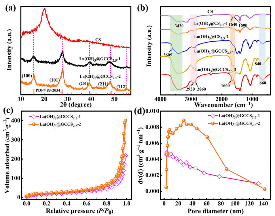 图 2.(a)样品的 X 射线衍射图谱,(b)傅里叶变换红外光谱,(c)氮气吸附-脱附曲线;(d)BJH 孔径分布曲线。