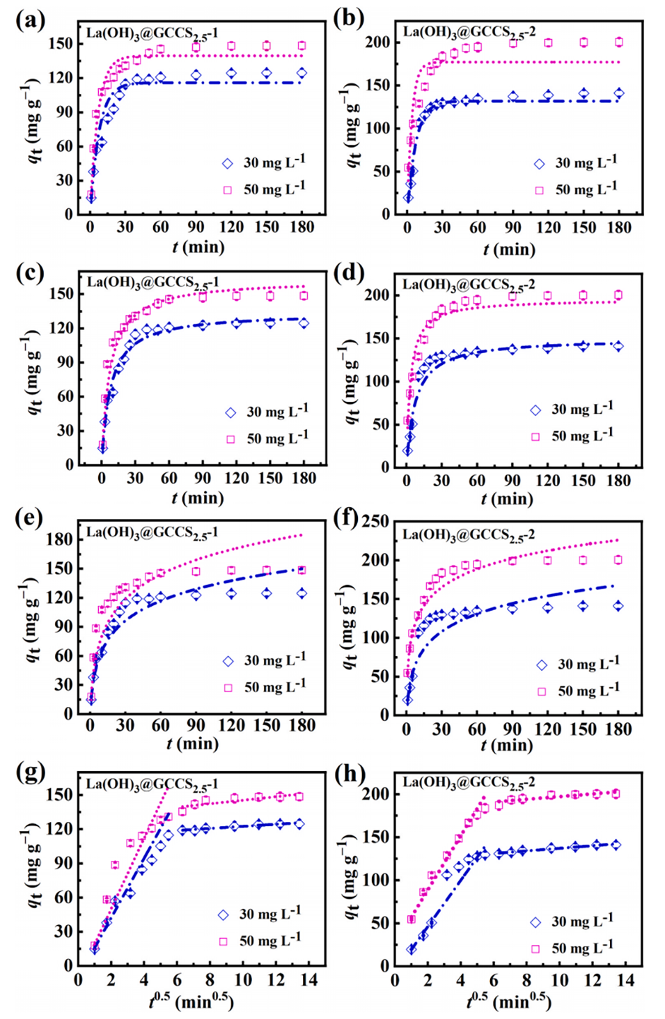 图 5.(a, b)两种样品的伪一级动力学模型;(c, d)伪二级动力学模型;(e, f)Elovich 模型;(g, h)颗粒内扩散模型(初始氟浓度C0=30, 50 mg L-1,pH=3,吸附剂投加量为0.2 g L-1,温度T=298 K)。