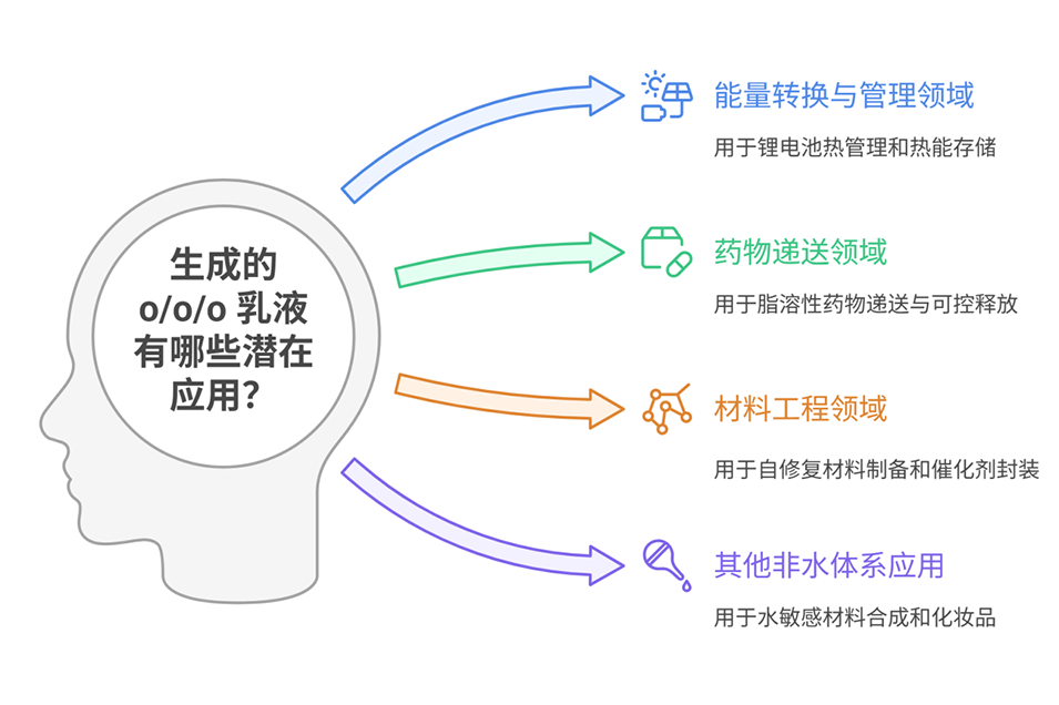 复合乳液通常包含水相,例如油包水包油(o/w/o)和水包油包水(w/o/w)乳液,它们在胶体科学中起基础性作用。油包油包油(o/o/o)乳液为非水试剂的应用提供了新途径,但在平衡多个有机相之间的力方面存在挑战。