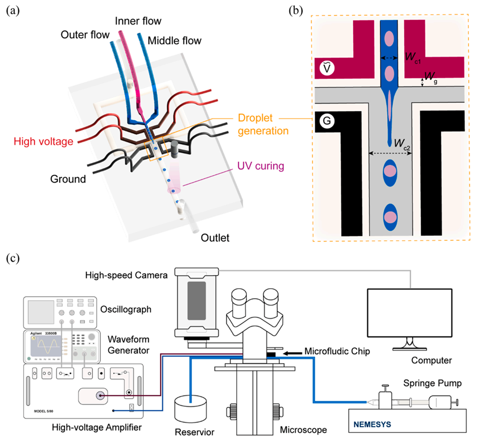 图 1. 微流控系统示意图。(a)微流控芯片。(b)流动结构。(c)实验装置。