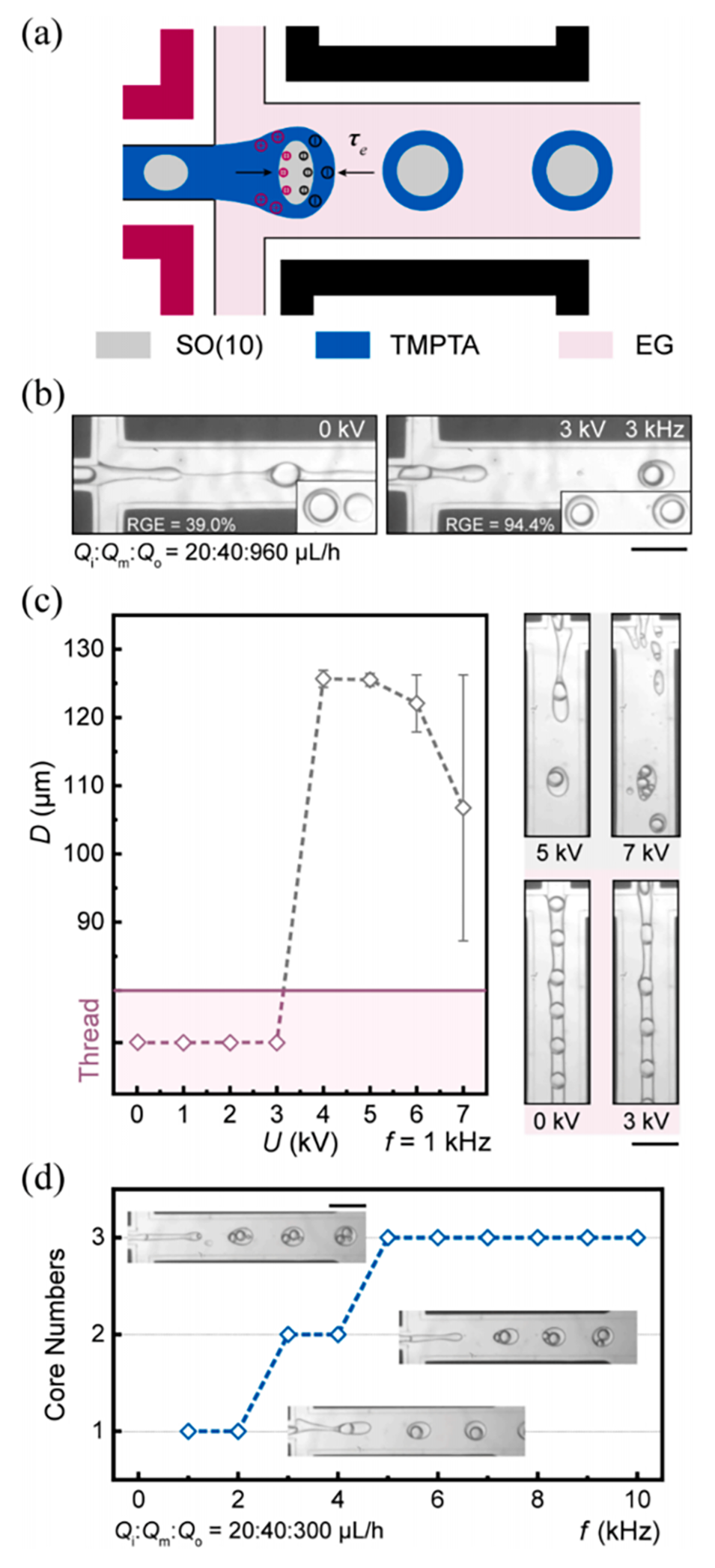 图 7. 相反转双乳液的电场效应。(a)电场应力分析。(b)电场对RGE的提升作用。(c)当频率f=1 kHz、Qi:Qm:Qo为20:40:300 μL/h时,不同电压下的状态转变。(d)当电压U=5 kV时,通过频率控制核数量。比例尺为300 μm。