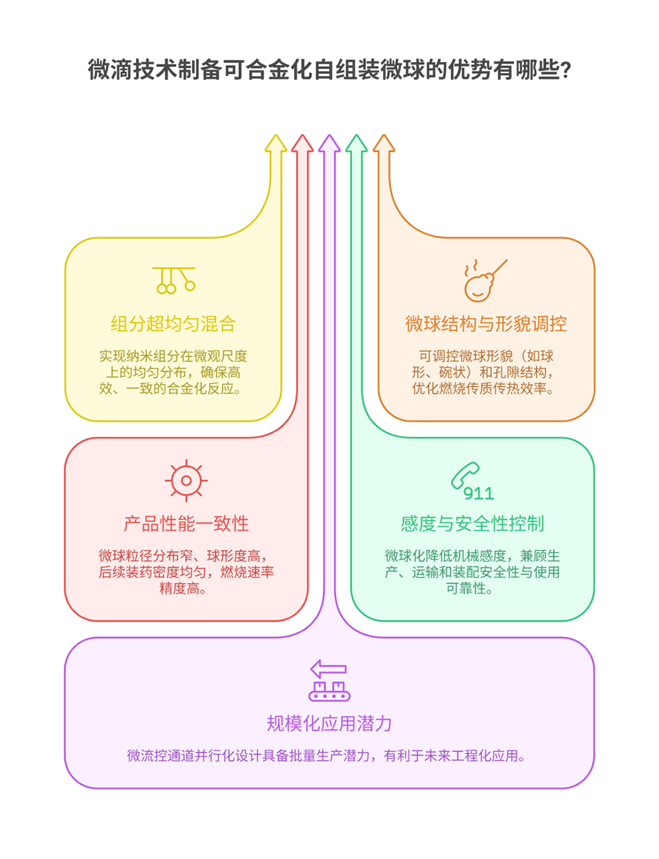 微滴技术制备可合金化自组装微球核心是通过微流控剪切形成微滴模板,结合溶剂扩散诱导原料自组装,最终实现硼(B)、钛(Ti)、氧化铜(CuO)等合金化反应所需原料的均匀复合,具体可分为3个关键阶段: