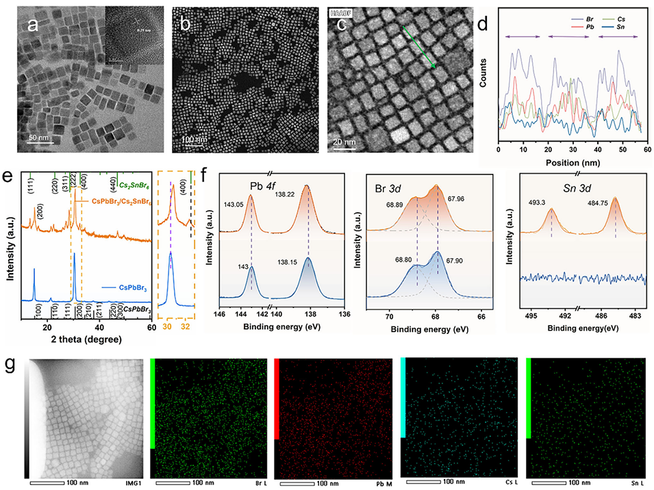 图4. 钙钛矿纳米晶的晶体结构及表面化学状态表征。a)纯CsPbBr₃纳米晶的TEM图像(插图为显示(200)晶面间距的HR-TEM图像);b)CsPbBr₃/Cs₂SnBr₆核壳结构纳米晶的扫描透射电子显微镜(STEM)图像;c)CsPbBr₃/Cs₂SnBr₆钙钛矿纳米晶的高分辨STEM图像及d)元素线扫描分布图;e)纯CsPbBr₃与CsPbBr₃/Cs₂SnBr₆核壳结构纳米晶的XRD图谱;f)纯CsPbBr₃与CsPbBr₃/Cs₂SnBr₆核壳结构纳米晶中Pb 4f、Br 3d及Sn 3d的高分辨X射线光电子能谱(HRXPS)对比图;g)CsPbBr₃/Cs₂SnBr₆核壳结构纳米晶的高角环形暗场扫描透射电子显微镜(HAADF-STEM)图像及对应的X射线能谱(EDS)元素映射图像。