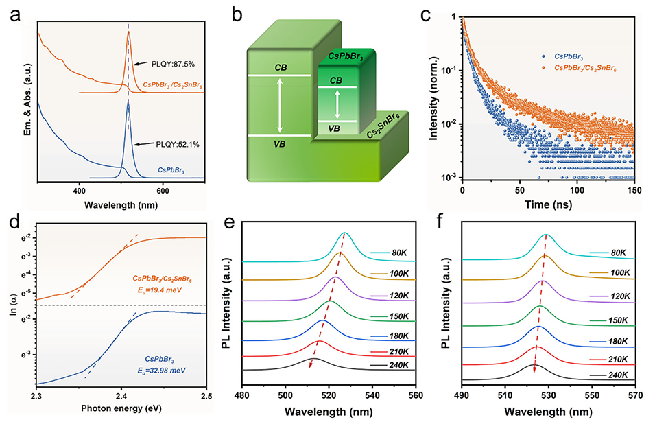 图5. 无铅双钙钛矿结构外延生长对CsPbBr₃纳米晶光学性能的影响。a)CsPbBr₃与CsPbBr₃/Cs₂SnBr₆纳米晶的吸收光谱、PL光谱及光致发光量子产率(PLQY)对比;b)CsPbBr₃/Cs₂SnBr₆的能带结构示意图;c)CsPbBr₃与CsPbBr₃/Cs₂SnBr₆纳米晶的时间分辨光致发光(TRPL)衰减曲线;d)从CsPbBr₃与CsPbBr₃/Cs₂SnBr₆纳米晶吸收光谱中提取的对数吸收系数与光子能量的关系图;e)CsPbBr₃、f)CsPbBr₃/Cs₂SnBr₆纳米晶的变温PL光谱。