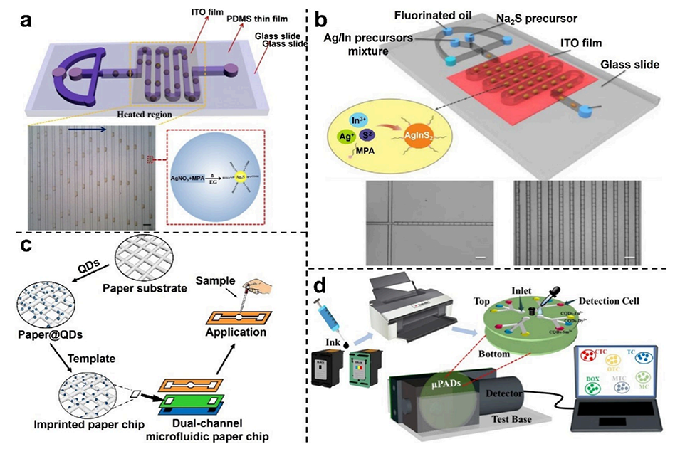 图 5(a)微反应器及液滴中水溶性硫化银(Ag2S)量子点(QDs)示意图;(b)液滴微流控芯片及液滴中量子点合成示意图;(c)双通道纸基微流控芯片示意图;(d)纸基微流控传感器阵列平台示意图
