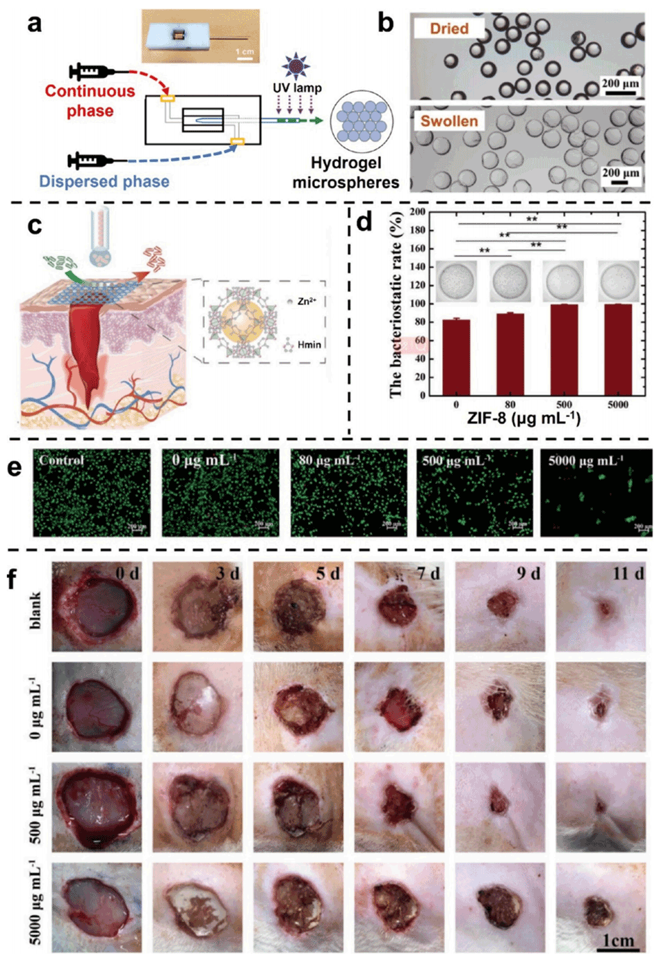 图 12(a)受乐高启发的微流控装置用于水凝胶微球合成;(b)干燥与溶胀状态下水凝胶微球(HMSs)的光学显微镜图;(c)负载 ZIF-8 的全疏水性水凝胶膜在伤口愈合中的应用;(d)不同 ZIF-8 负载浓度的膜材料抑菌性能;(e)荧光染色的 NIH3T3 细胞荧光图像;(f)0-11 天不同时间点的伤口模型照片