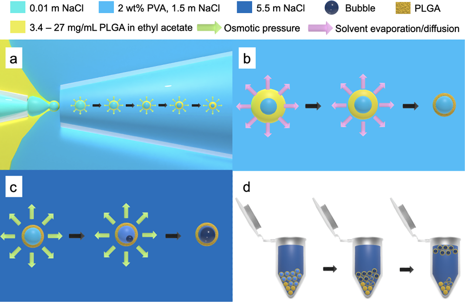 图1. GEM 的制备与应用概述。(a)微流控制备双乳液及后续通过渗透退火减小水核尺寸的示意图;(b)从双乳液中去除溶剂(粉色箭头)以形成微胶囊的过程;(c)渗透诱导空化作用促使水核中气泡成核与生长的过程,绿色箭头代表渗透梯度驱动下水分从微胶囊内渗出;(d)利用浮力实现 GEM 与破损微胶囊及聚合物碎片的分离过程。