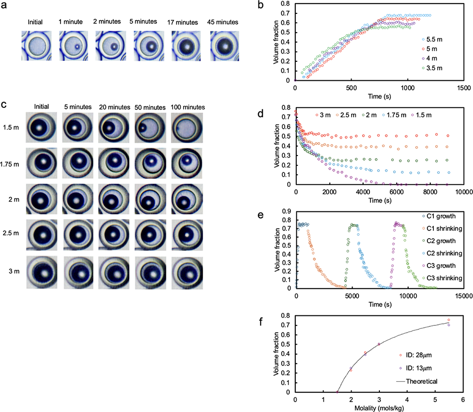 图3.(a)在氯化钠浓度 5.5 mol/kg 条件下,45 分钟内微胶囊中气泡成核与生长的显微图像,微胶囊编号对应的外径(OD)分别为 13 μm 和 18 μm;(b)不同氯化钠浓度(5.5 mol/kg,蓝色;5 mol/kg,红色;4 mol/kg,紫色;3.5 mol/kg,绿色)下,气泡体积分数随时间变化的关系图;(c)在不同氯化钠浓度(3 mol/kg、2.5 mol/kg、2 mol/kg、1.5 mol/kg)条件下,微胶囊中气泡受控收缩的显微图像,微胶囊编号对应的外径(OD)分别为 13 μm 和 18 μm;(d)不同氯化钠浓度(3 mol/kg,红色;2.5 mol/kg,橙色;2 mol/kg,绿色;1.75 mol/kg,青色;1.5 mol/kg,紫色)下,气泡体积分数随时间变化的关系图;(e)在氯化钠浓度分别为 5.5 mol/kg(气泡生长)和 1.5 mol/kg(气泡收缩)条件下,微胶囊核心内气泡生长与收缩的可逆性随时间变化的关系图,其中蓝色代表循环 1 生长、橙色代表循环 1 收缩、深绿色代表循环 2 生长、青色代表循环 2 收缩、紫色代表循环 3 生长、绿色代表循环 3 收缩;(f)编号为 13 μm 和 28 μm 的微胶囊,其核心内气泡体积分数与盐浓度(单位:mol/kg)的实验值和理论值对比图,实验结果的误差棒过小,未在图中显示。