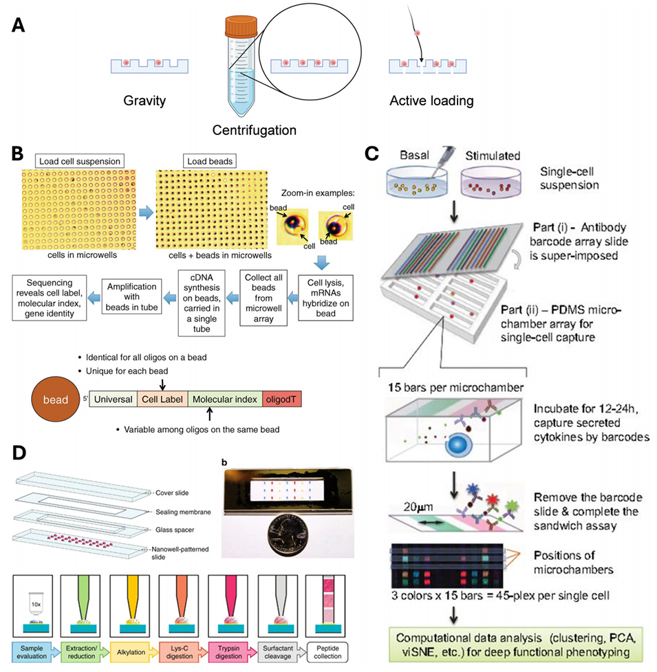 图4. 用于单细胞组学研究的微孔系统。(A)微孔中单细胞加载方式示意图:包括重力介导的单细胞加载、离心介导的单细胞加载,以及流体流动引导的主动式单细胞加载。(B)CytoSeq 技术用于单细胞 RNA 测序的示意图:该系统包含一个微加工制备的表面,其上布满与单细胞尺寸匹配的微孔阵列;通过重力作用完成单细胞加载后,引入带有独特细胞条形码和独特分子标识符(UMI)的微珠,可实现聚合酶链式反应(PCR)偏差校正与基因表达绝对定量分析。(C)基于荧光检测的微孔系统单细胞蛋白质组研究示意图:将抗体条形码阵列玻片与加载了单细胞的微孔贴合,进行孵育与蛋白质分泌反应;目标蛋白质被玻片捕获后,通过荧光标记的二抗实现检测。(D)用于单细胞质谱(MS)分析的微孔阵列:nanoPOTS 技术可在纳米级微孔内完成细胞裂解、蛋白质消化及肽段制备;与传统管级样本制备方法相比,该技术可减少 99.5% 的试剂消耗。