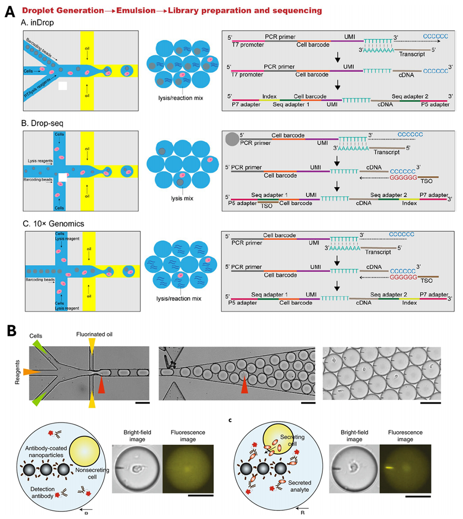 图5. 用于单细胞组学研究的液滴微流控平台。(A)InDrop、Drop-Seq 及 10× Genomics 技术用于单细胞 RNA 测序的工作原理示意图。(B)DropMap 技术用于单细胞分泌分析的示意图:该技术可实现对细胞抗体分泌过程的实时动态监测。