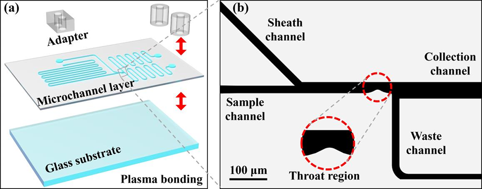 图3:微流控芯片的设计与制造。(a) 芯片结构爆炸图: 芯片由适配器、微通道层和加强层(玻璃基片)通过氧等离子体键合而成。(b) 分选区域结构: 展示了喉道形状的微通道,该设计可缩短细胞与光镊之间的距离,从而增强光学梯度力。