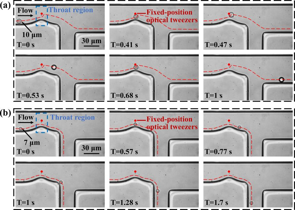 图2:10μm与7μm颗粒的分选轨迹。(a) 10μm颗粒被分选的过程: 高速相机记录显示,颗粒在喉道区域与光镊相互作用后被成功偏转至收集通道。(b) 7μm颗粒未被分选的过程: 该颗粒因光学力不足,始终沿样品流运动,最终进入废液通道。