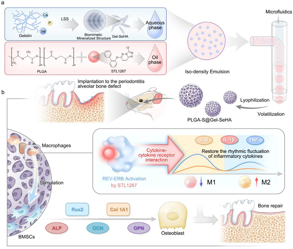 近期,华中科技大学陈莉莉教授、王一帆副教授团队针对牙周炎引发的牙槽骨缺失难题,开发出一种新型多孔微球材料PLGA-S@Gel-SeHA。该材料通过持续释放靶向昼夜节律核受体REV-ERB的小分子STL1267,有效平抑了炎症因子的异常波动,引导巨噬细胞向促修复的M2表型极化,从而在炎症环境下成功实现了牙槽骨的显著再生。相关研究以“Porous Microspheres Loading Small Molecule Targeting REV-ERBs Modulate Inflammatory Cytokines Fluctuations to Promote Periodontal Bone Regeneration”为题,发表于期刊《Advanced Healthcare Materials》。