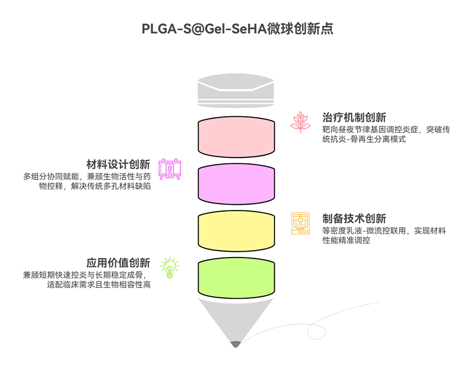 1、本研究开发了一种新型多孔微球PLGA-S@Gel-SeHA,它由PLGA、明胶矿化掺硒羟基磷灰石(Gel-SeHA)和靶向昼夜节律核受体REV-ERBs的小分子激动剂STL1267组成。