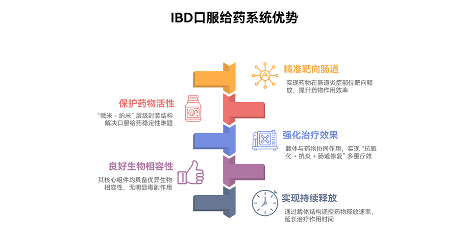 炎症性肠病(IBD)是一类慢性复发性肠道炎症疾病,主要涵盖克罗恩病与溃疡性结肠炎,患者常伴随腹痛、腹泻、体重下降等症状,严重影响生活质量。目前临床常用治疗手段(如抗炎药、免疫抑制剂)存在疗效有限、副作用显著、药物生物利用度低等问题;同时,具有抗炎潜力的天然抗氧化酶口服时易受胃部酸性环境与消化酶破坏,且在炎症肠道部位滞留不足,难以发挥有效治疗作用。因此,开发安全、稳定且能实现药物靶向递送的新型口服给药系统,成为攻克IBD治疗难题的关键方向。