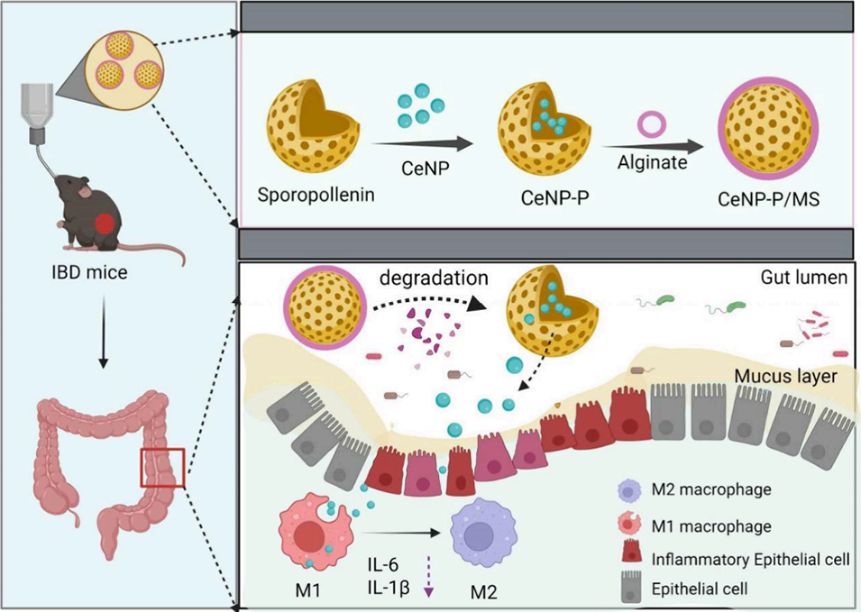1、本研究开发了一种基于孢子花粉素与氧化铈纳米酶(CeNP)的杂化微球口服递送系统(CeNP-P/MS),用于炎症性肠病(IBD)的治疗。