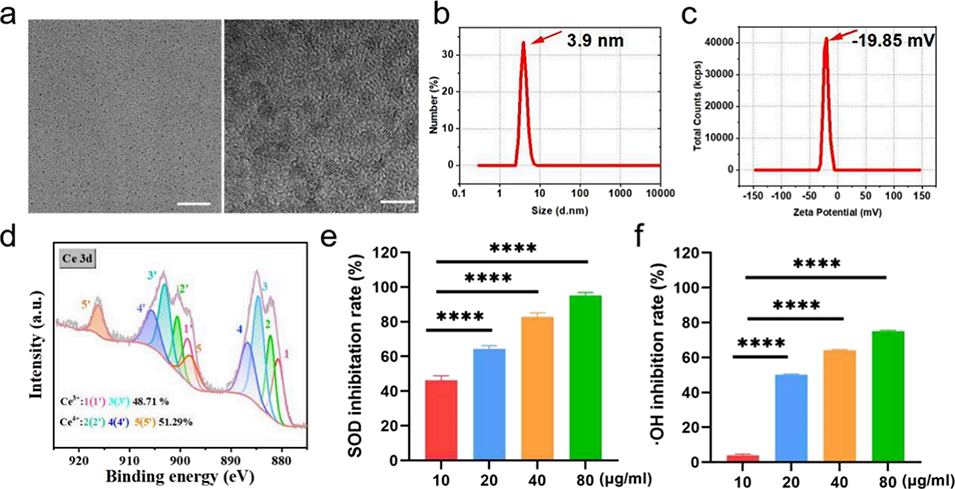 图2. 氧化铈纳米酶(CeNP)的形态与酶活性表征。(a)CeNP的透射电子显微镜(TEM)图像,比例尺:左侧20 nm,右侧5 nm;(b, c)CeNP的粒径分布(b)与zeta电位(c);(d)CeNP的X射线光电子能谱(XPS);(e, f)CeNP的超氧化物歧化酶(SOD)模拟活性与过氧化氢酶(CAT)模拟活性(n=3,n代表实验重复次数)。