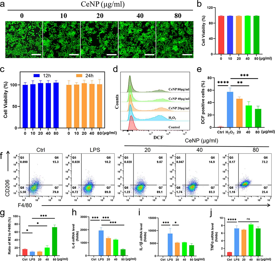 图4. CeNP的抗氧化与抗炎性能。(a, b)细胞活性的活/死染色结果(a)与分析(b),比例尺50μm;(c)Raw 264.7细胞(小鼠巨噬细胞系)与CeNP共孵育12h和24h后的细胞计数试剂盒-8(CCK-8)活性检测结果;(d, e)细胞内活性氧(ROS)水平的流式细胞术检测(d)与定量分析(e),比例尺200μm;(f, g)CeNP作用后F4/80+(泛巨噬细胞标志物)与CD206(M2型巨噬细胞标志物)的流式细胞术(FACS)分析(f)与定量分析(g);(h-j)CeNP作用后白细胞介素-6(IL-6,h)、白细胞介素-1β(IL-1β,i)与肿瘤坏死因子-α(TNF-α,j)的mRNA表达水平。所有数据均以“平均值±标准差”表示(n=3),统计学显著性标注:P<0.05、**P<0.01、***P<0.001。