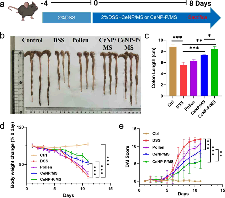 图5. CeNP-P/MS对葡聚糖硫酸钠(DSS)诱导的急性结肠炎小鼠的治疗效果。(a)体内实验时间线;(b)不同处理组小鼠大肠的大体外观图像;(c)不同处理组小鼠肠长度的定量分析;(d)急性结肠炎小鼠经不同处理后的相对体重变化;(e)每日疾病活动指数(DAI,用于评估结肠炎严重程度)评分。