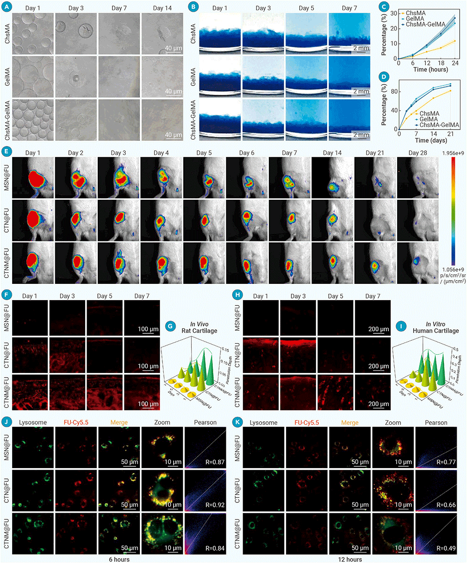 3、CTNM@FU具备三步程序化功能:通过基质金属蛋白酶(MMPs)响应及II型胶原靶向肽(WYRGRL)主动靶向受损软骨;有效穿透软骨基质并进入软骨细胞;逃逸溶酶体降解并释放Fucoidan。