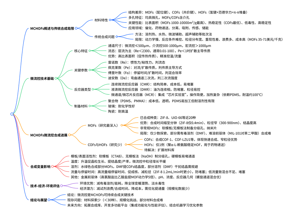 金属有机框架(MOFs)、共价有机框架(COFs)和氢键有机框架(HOFs)(统称MCHOFs)在催化、药物递送、分离和吸附等领域应用广泛。然而,传统合成方法存在动力学缓慢、反应条件控制不精确、产物粒径分布宽及重复性差等问题。微流控合成作为一种绿色高效的替代方案,能精确控制反应条件和产物性能,显著缩短合成时间至分钟级,并减少废物生成。