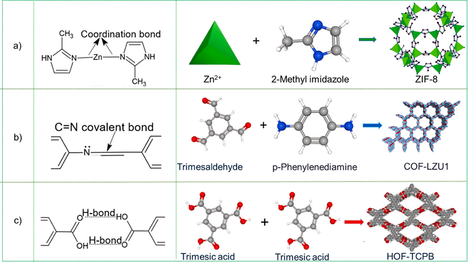 图6. 化学反应示意图:(a)ZIF-8(MOF)的配位键形成;(b)COF-LZU(COF)的C-N共价键形成;(c)HOF-TCPB(HOF)的氢键形成及三维材料结构