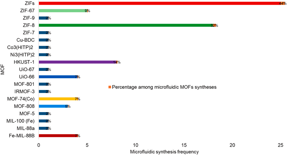 图9. 截至2025年4月2日,微流控制备的MOFs及各MOF相关合成研究的报道数量