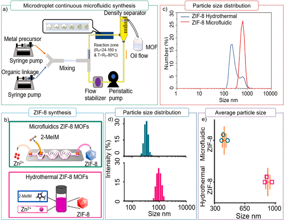 图10.(a)液滴微流控反应器;(b)液滴微流控反应器与水热法制备ZIF-8的粒径分布对比;(c)微芯片反应器与水热反应器;(d)微芯片反应器与水热法制备ZIF-8的粒径分布对比;(e)微芯片反应器与水热法制备ZIF-8的粒径对比