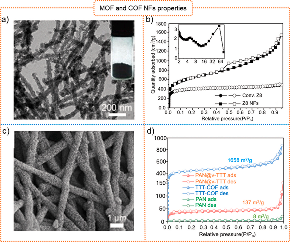 图18.(a)ZIF-8纳米纤维的扫描电子显微镜(SEM)图像;(b)传统ZIF-8与ZIF-8纳米纤维的吸附-脱附等温线及BJH孔径分布;(c)COFs纳米纤维的扫描电子显微镜(SEM)图像;(d)COFs纳米纤维的吸附-脱附等温线