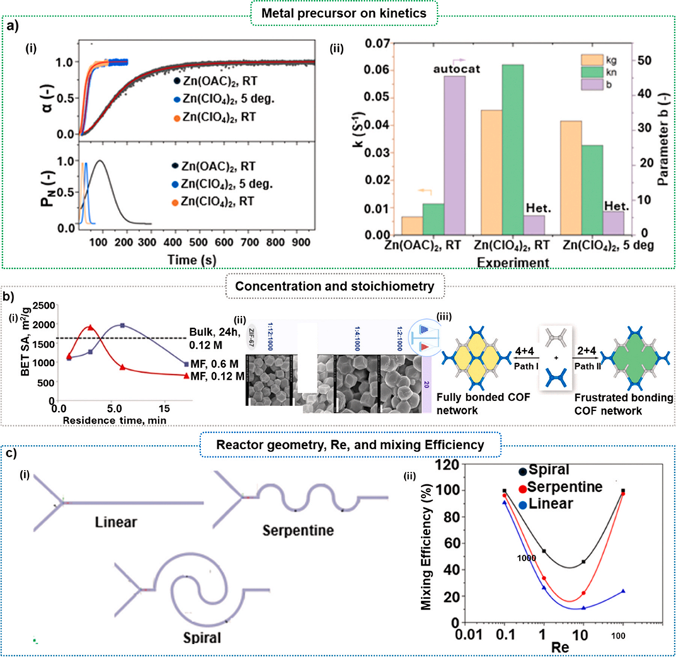 图22.(a)金属前驱体对动力学的影响:(i)Gualtieri拟合及Gualtieri模型参数、(ii)使用高氯酸盐与乙酸盐阴离子时的动力学常数;(b)(i)不同停留时间下浓度与MOF比表面积的关系、(ii)试剂化学计量比对ZIF-67颗粒形貌的影响、(iii)亚化学计量条件下化学计量比对COFs的影响;(c)螺旋、蛇形与线性反应器结构,及不同雷诺数(Re)下三种反应器的混合指数