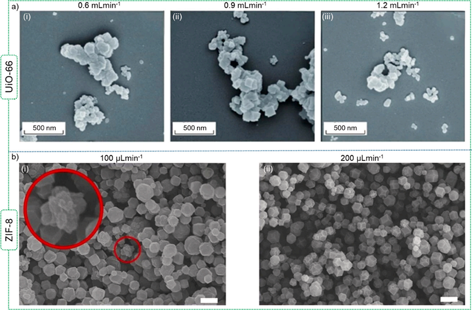 图21.(a)流速对UiO-66的影响;(b)微流控合成中ZIF-8的晶粒尺寸