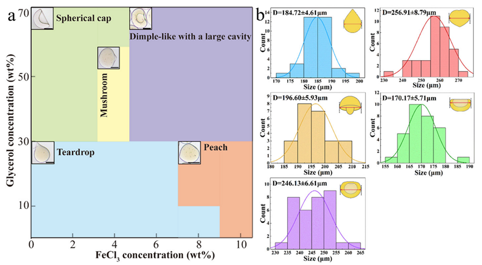 图6. a)以DP为含10 wt%甘油的SA溶液为例,展示了在甘油(0–70 wt%)和FeCl3(2–10 wt%)浓度变化的收集液中生成的海藻酸铁微凝胶的形态相图。插图为四种不同形态的光学显微镜图像:尖尾蘑菇状、红细胞状、蘑菇状和凸透镜状。b)四种形态的海藻酸铁微凝胶的粒径分布图。