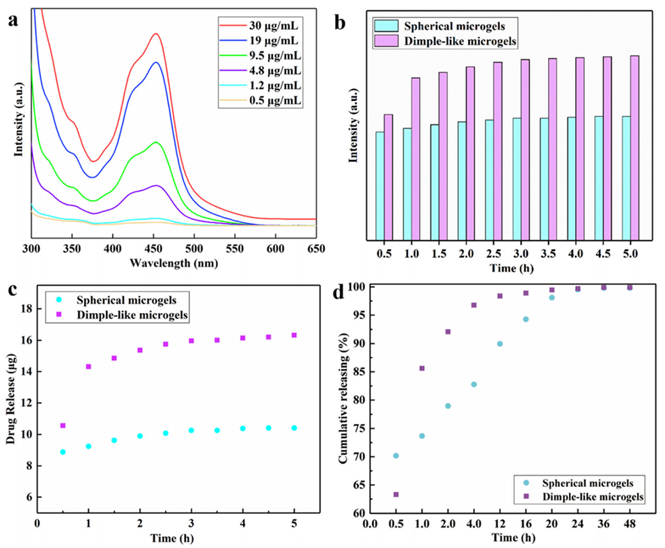 3、特定条件下制备的凹陷微凝胶在载荷释放方面表现优异,5小时内释放率高达98%,显著优于球形微凝胶(82%)。该研究为微凝胶形态调控提供了新策略,在需快速控释的递送系统中具有较大的应用潜力。