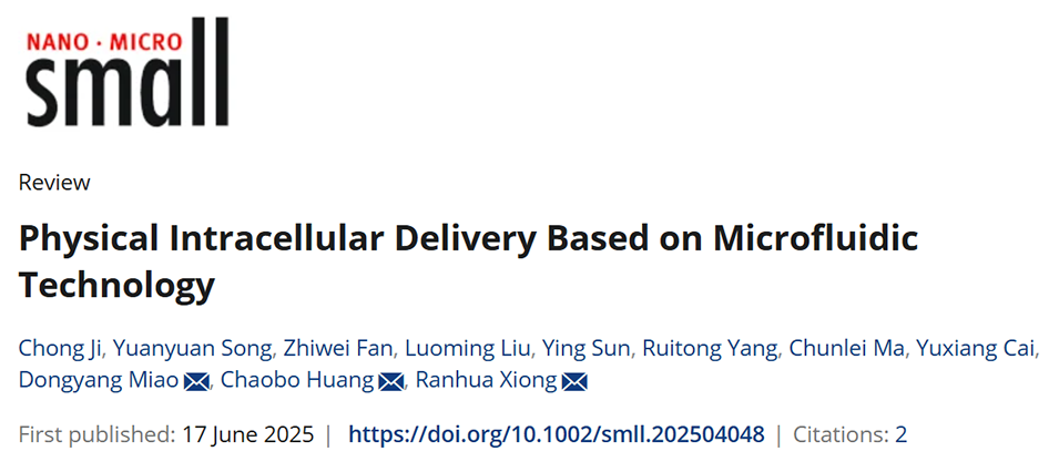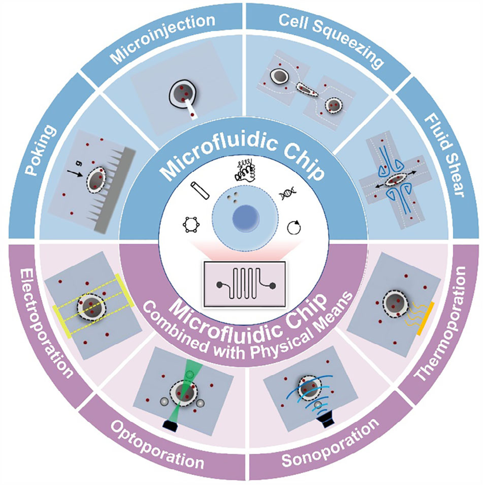 近期,南京林业大学熊燃华教授、黄超伯教授、缪东洋等人发表综述,系统梳理了基于微流控芯片的物理性细胞内递送策略。文章将现有方法归纳为两大类:一类依赖微通道结构设计(如微注射、细胞挤压与流体剪切力)直接扰动细胞膜;另一类则结合外部物理场(如电、光、声、热)以提升递送效率与特异性,并详细探讨了其机制、优势及挑战。相关研究成果以“Physical Intracellular Delivery Based on Microfluidic Technology”为题,发表于期刊《Small》。