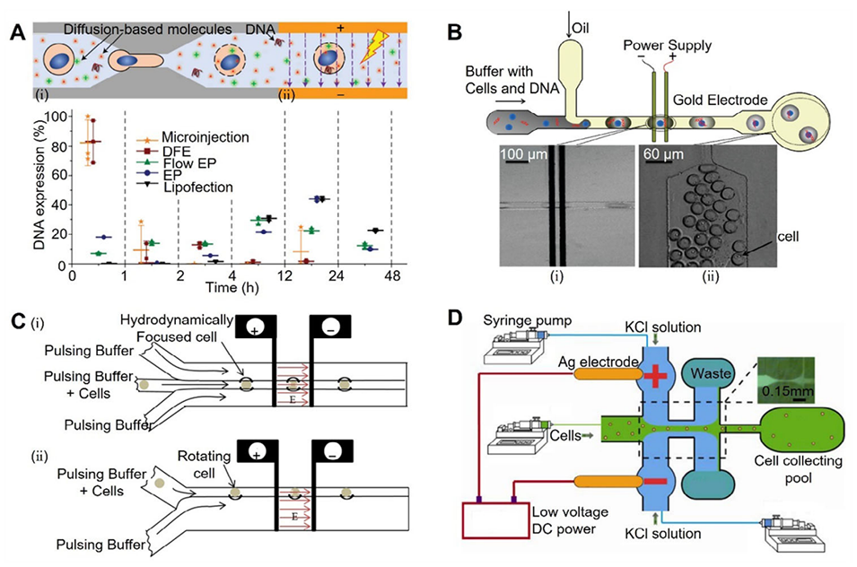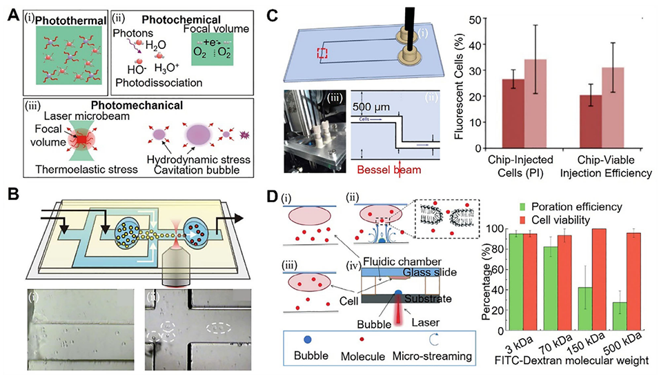 2、其核心递送方法分为两类:一是仅依赖芯片结构设计的微注射、细胞挤压、流体剪切力;二是结合外部物理场的电穿孔、光穿孔、声穿孔、热穿孔。文章重点阐述了各类方法的机制、具体途径、应用、优势与局限性。