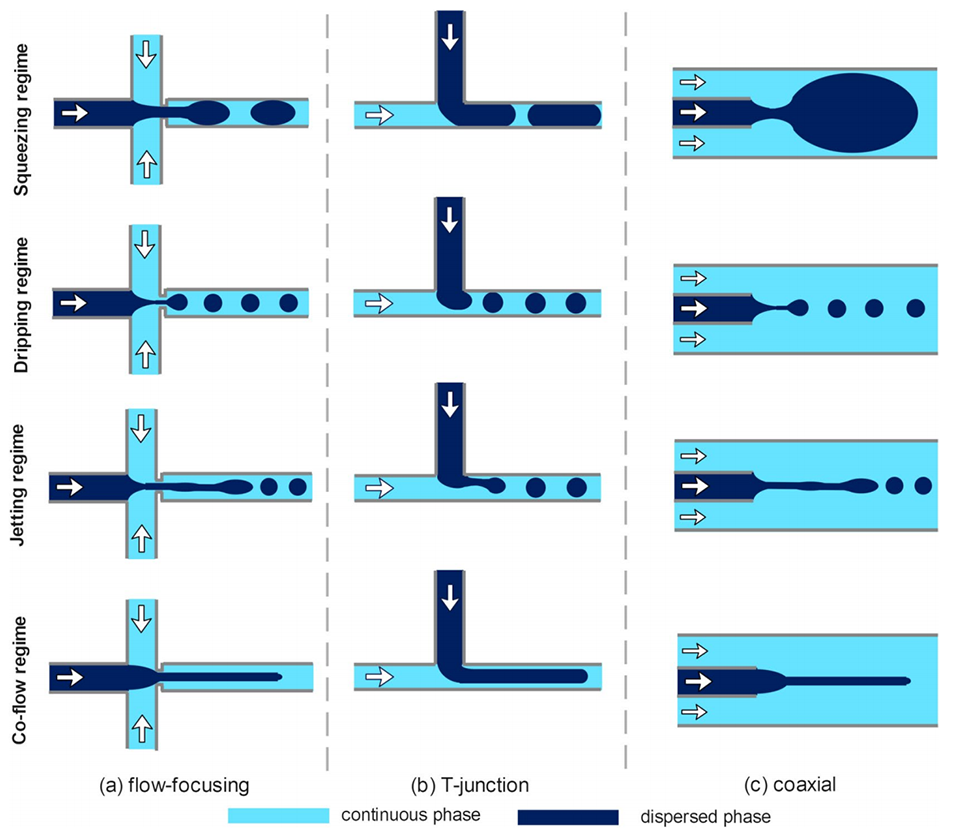 图6:双乳液微流控液滴的生成(a. 流动聚焦法、b. 串联 T 型结法)