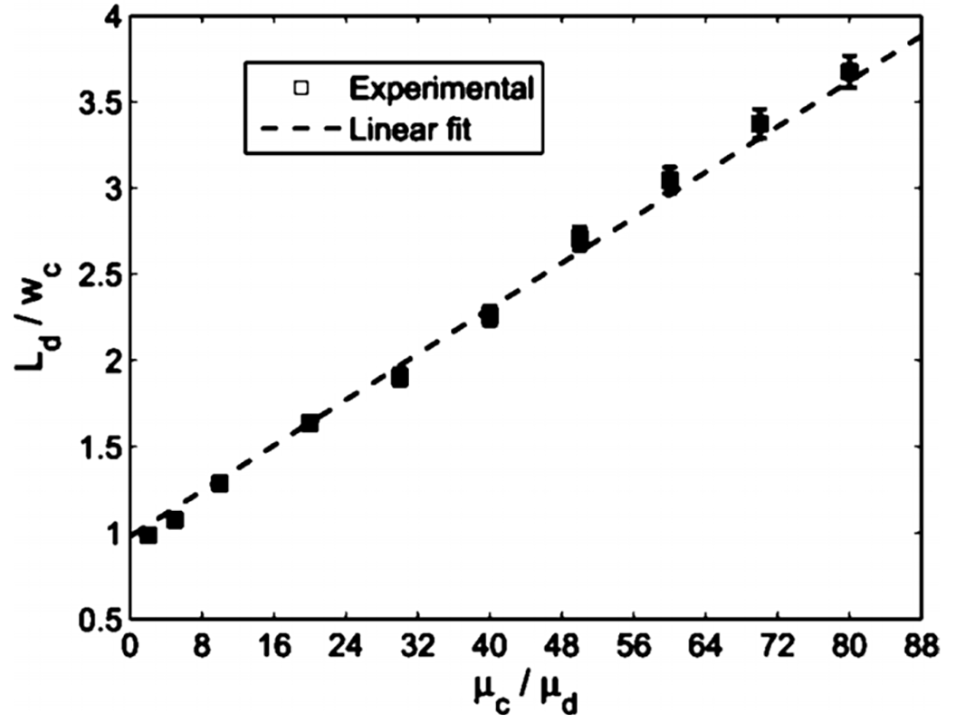 图9:微流控液滴长度随相粘度比变化的实验观测(含拟合曲线)